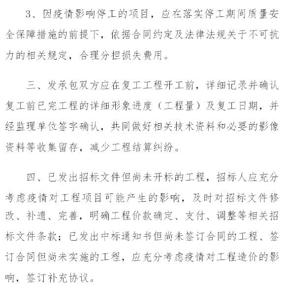 (三)疫情防控期間未復(fù)工的項目,合同價格調(diào)整按照法律法規(guī)及合同條款,參照不可抗力有關(guān)規(guī)定及約定合理分擔(dān)損失。