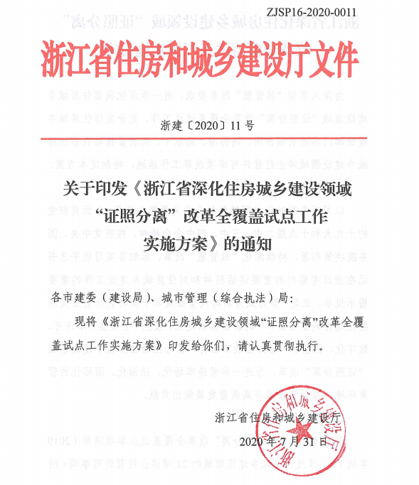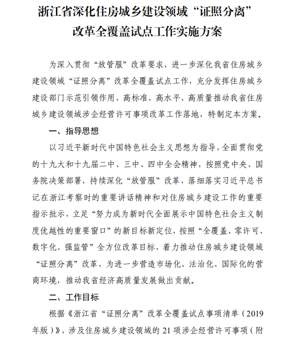 8月11日,浙江省住建廳印發(fā)《浙江省深化住房城鄉(xiāng)建設領域“證照分離”改革全覆蓋試點工作實施方案》。