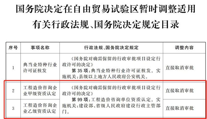 2019年11月15日,國發(fā)〔2019〕25號《國務(wù)院關(guān)于在自由貿(mào)易試驗(yàn)區(qū)開展“證照分離”改革全覆蓋試點(diǎn)的通知》中提到在試點(diǎn)區(qū)域直接取消工程造價(jià)咨詢企業(yè)甲級、乙級資質(zhì)認(rèn)定。